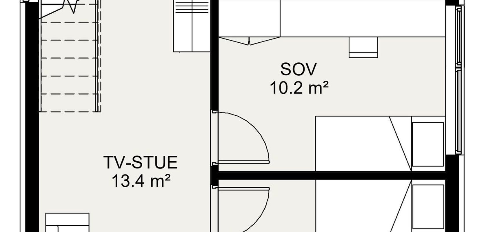 I andre etasje er det et stort rom med skrå himling, hvor du finner spisestuen, kjøkkenet og stuen. Rommet har en fantastisk takhøyde på opptil fire meter på det høyeste, og peisen er plassert midt i rommet for å gi deg glede fra både spisestuen og stuen. Kjøkkenet har en fin L-form med god plass, og fra spisestuen kan du gå ut på balkongen, som er lunt på varme dager takket være veggene på to kanter. I denne etasjen er det også et stort soverom med walk-in-closet, et bad og en bod.