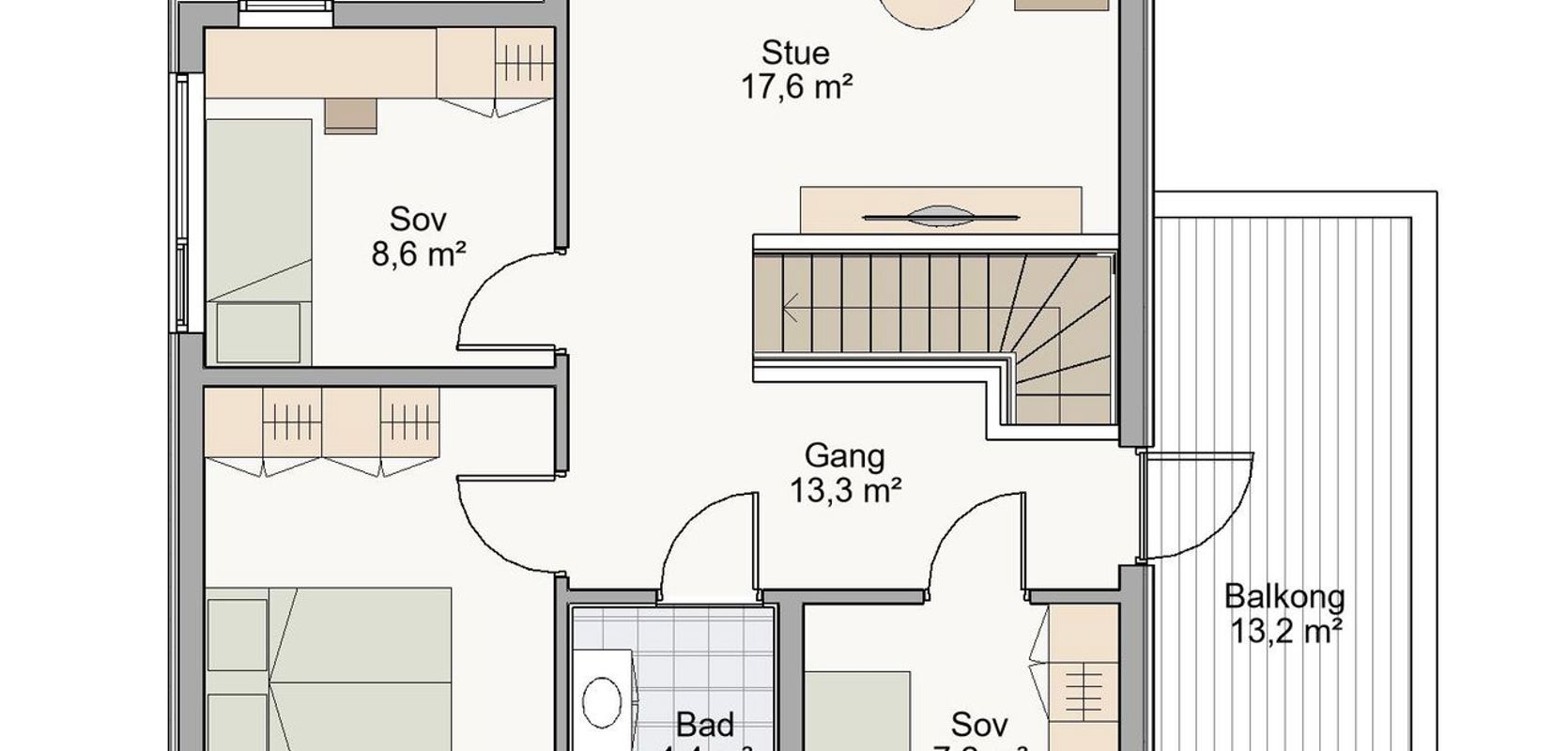 Huset har pulttak og skrå himling, slik at man i andre etasje får en flott takhøyde på loftstuen. Det er to balkonger ut ifra andre etasjen, slik at man kan velge hele dagen om man ønsker å følge sola eller skyggen. Balkongen ut fra loftstuen er overbygd og har vegger på to kanter. Det gjør balkongen lun og fin. Glassrekkeverket gjør at den allikevel føles luftig. Andre etasjen har også tre soverom og et bad.